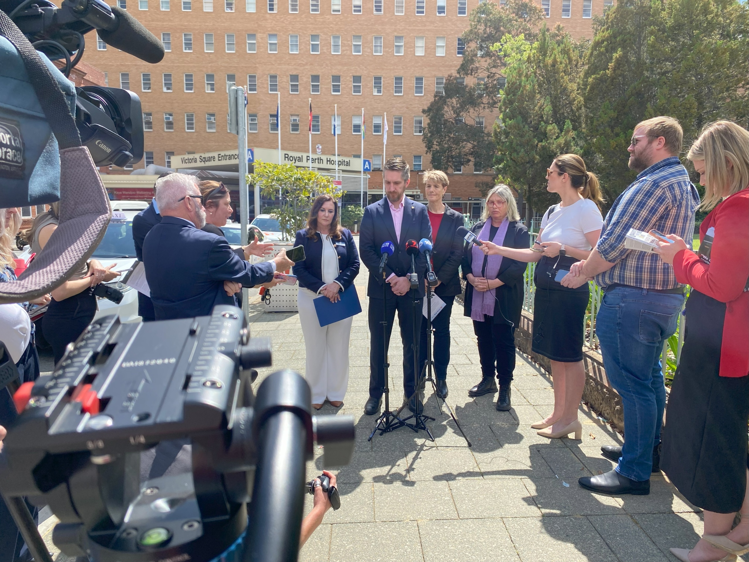 United health workers and their representative unions the Australian Medical Association, the Australian Nursing Federation, Health Services Union and United Workers Union launch a five-point plan to tackle ramping.