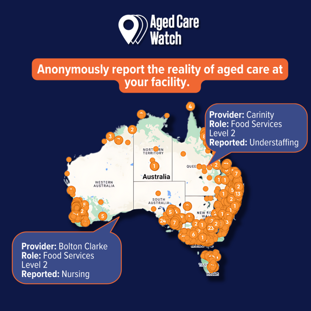 Aged Care Watch is a crowd-sourced reporting tool that allows aged care workers, residents, family, and community members to anonymously report on and publicly name facilities that implement insufficient care time and manipulative practices, holding them accountable.