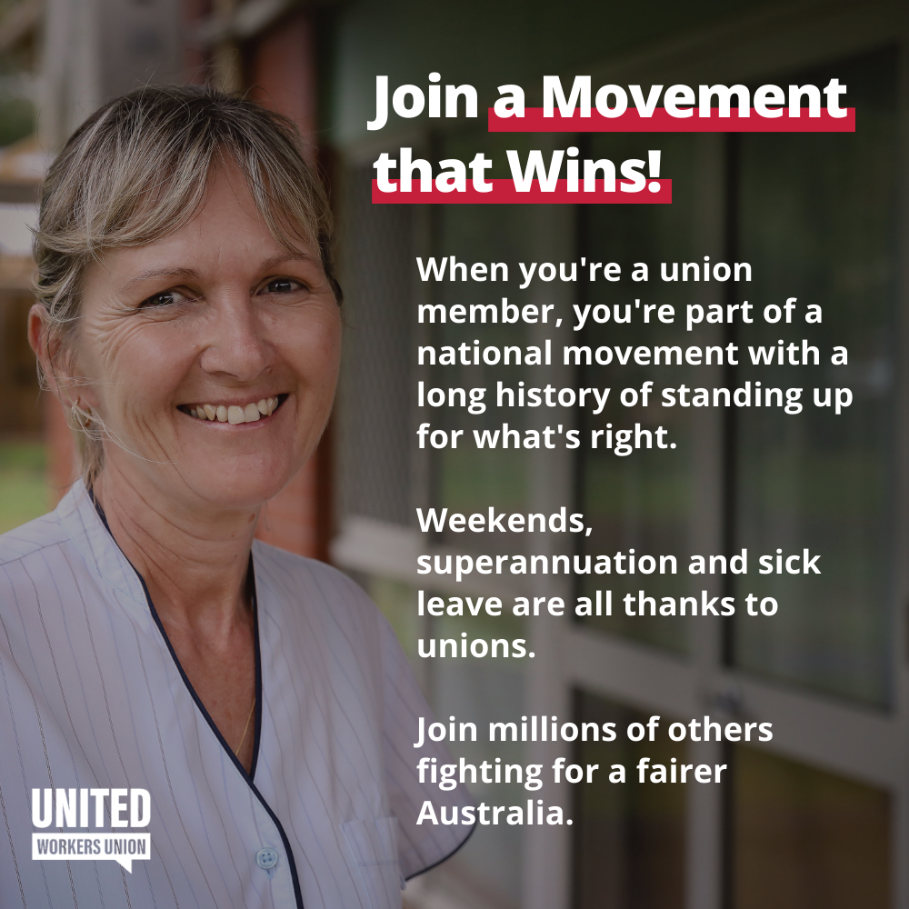Union members have won the rights and conditions we all enjoy today over decades of organising, campaigning, and taking action. Sick leave, weekends, overtime, annual leave, redundancy, penalty rates and long service leave, and universal superannuation were all hard-fought union wins. United Workers Union members defend these wins everyday by being union, and our fight for secure jobs, domestic violence leave, increased superannuation and other rights and conditions continues.