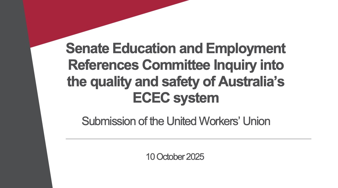 UWU submission to the Senate Inquiry into Quality and Safety of Australian Early Childhood Education and Care. UWU recommended that the Australian Government adopt UWU’s safer staffing action plan, increase regulation of for-profit providers and move towards public provision of ECEC.