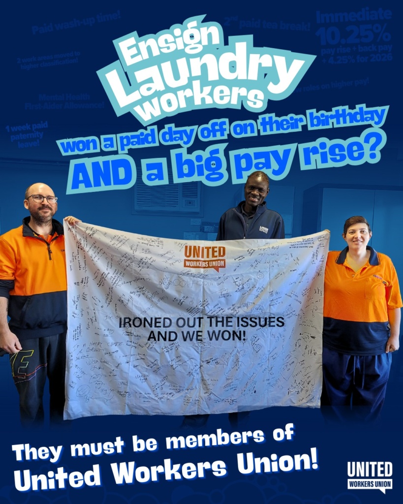 Laundry workers at Ensign in Perth won real change, better wages and even a paid day off on their birthdays!