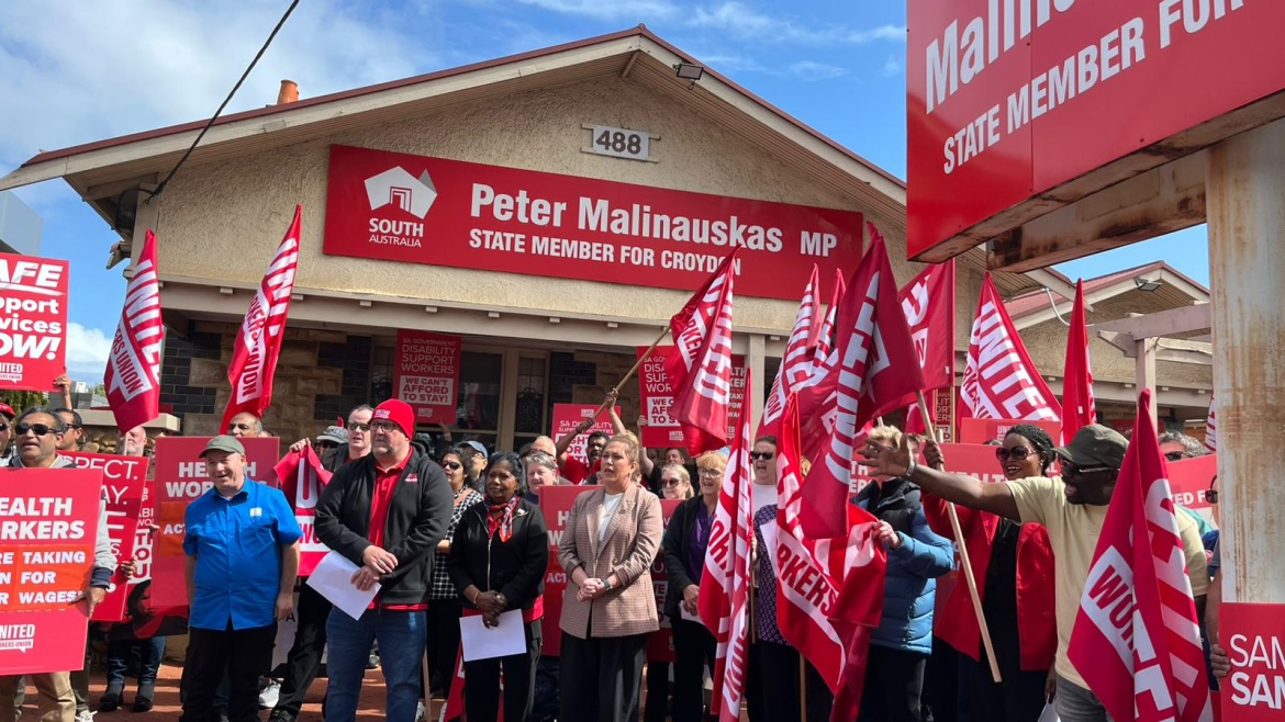 Rally at Mali's of more than 200 Health Support Workers representing all hospitals in both major metro hospital networks, Disability Support Officers, Early educators and aged care workers.