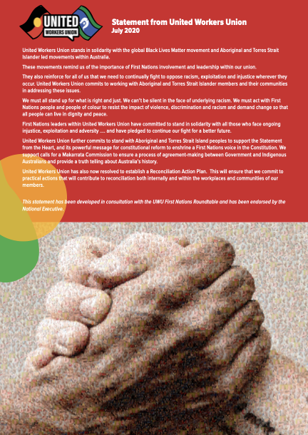 RECONCILIATION RESOURCES Downloadable resources First Nations RAP [PDF] Download PDF Indigenous Voice and Co-Design Processes [PDF] Download PDF UWU Communications and Protocols [pdf] Download PDF Uluru Statement from the Heart [PDF] Download PDF First Nations Roundtable Terms of Reference [PDF]Download PDF Letter to Leader of the Opposition: Enshrined Voice to Parliament [PDF]Download PDF National Reconciliation Week resources list [PDF]Download PDF Employment & Income Factsheet [PDF]Download PDF Acknowledgement of Country [PDF]Download PDF UWU Flags Flyer [PDF]Download PDF Timeline of Aboriginal & Torres Strait Islander Peoples in the Labour Movement [PDF]Download PDF Black Lives Matter Statement [PDF]Download PDF LEARN MORE ABOUT THE LANDS ON WHICH WE LIVE & WORK: Welcome to Country